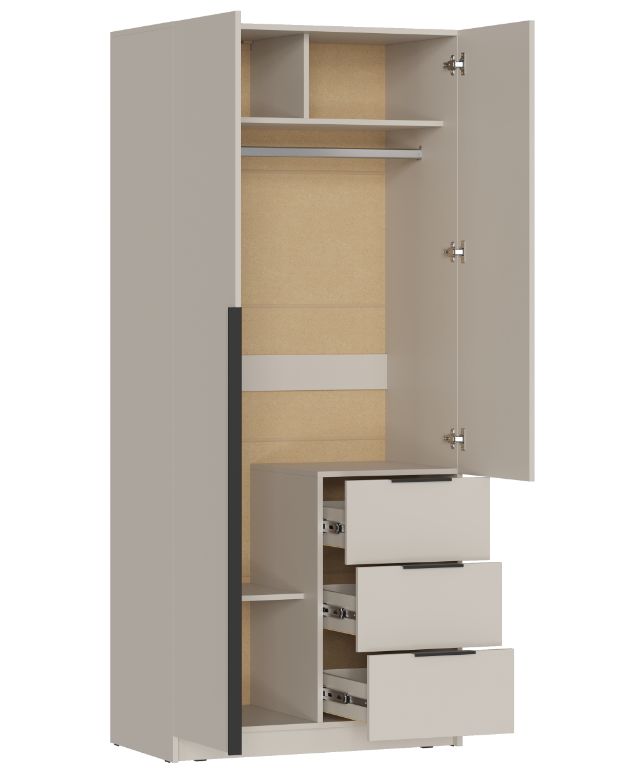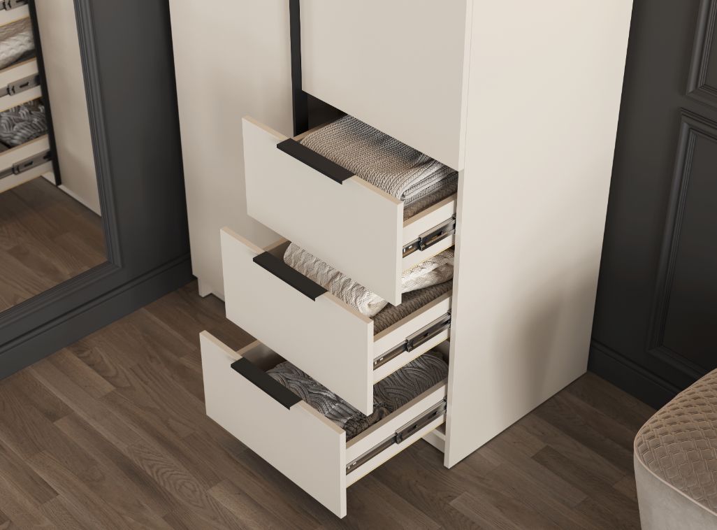 - Элегантный дизайн: Накладные фасады шкафа выполнены в стильном цвете "Кашемир". Левая створка и фасады ящиков оснащены черными пластиковыми ручками, а правая створка - без ручки, что добавляет минималистичный акцент.