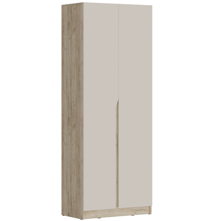 — Без ручек: открывание осуществляется за декоративный вырез на левой створке, а зазор между фасадами закрыт декоративной планкой в цвет корпуса. Это придает шкафу современный минималистичный вид.